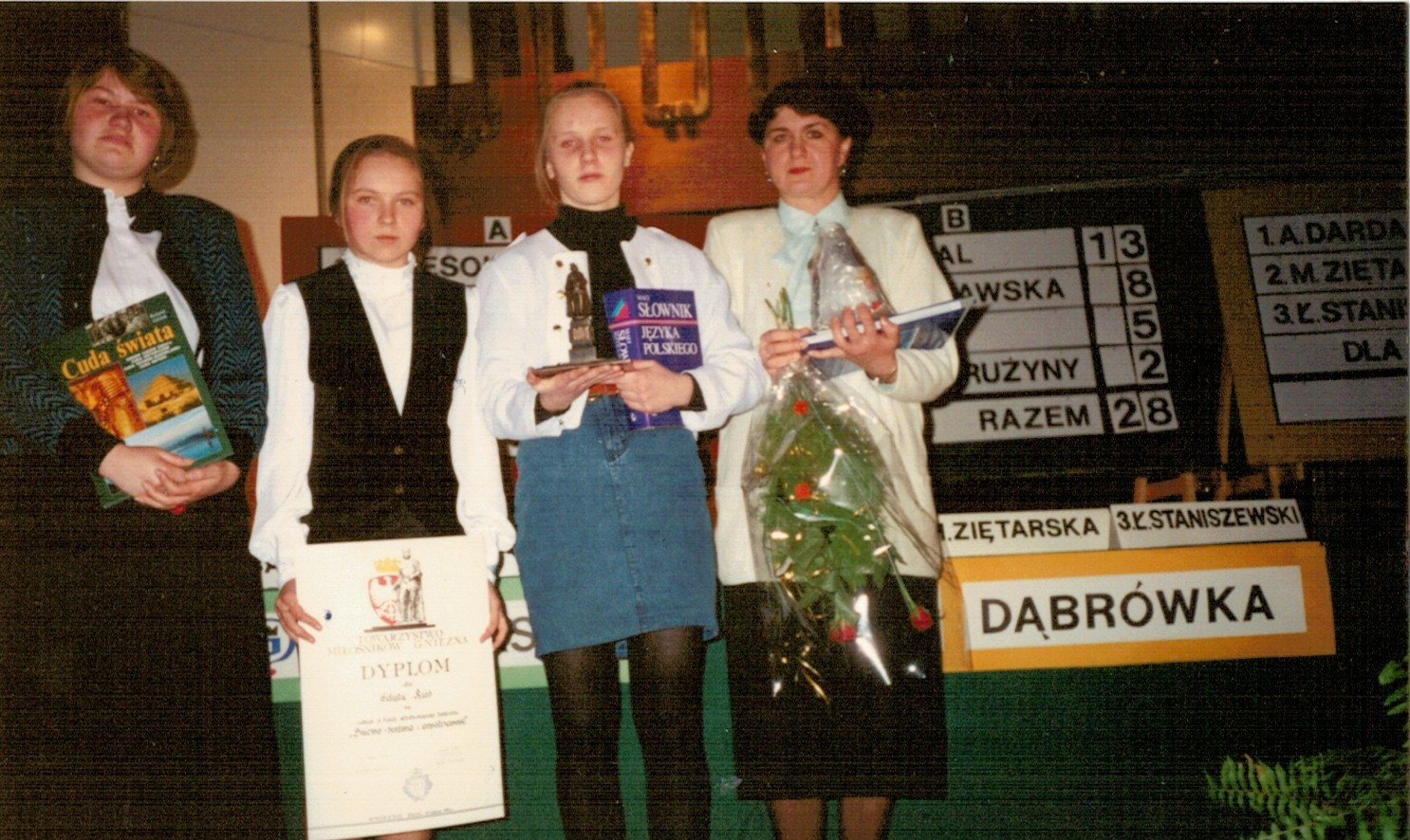 Triumfatorzy konkursu w 1994 r. – drużyna SP 12: Magdalena Korbal, Daria Podstawska i Edyta Rus wraz z opiekunką Marią Szczepaniak