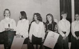 Najlepsze drużyny w 1992 r. Od lewej: reprezentanci SP 12 – Marta Zientarska (ze statuetką Bolesława Chrobrego), Anna Olszewska, Barbara Cichocka; uczniowie II LO – Aurelia Olejniczak, Arkadiusz Kornacki, ?